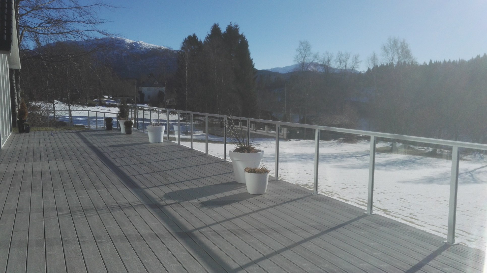 Stolpefrie glassrekkverk gir et helt sømløst og moderne uttrykk der utsikten får spille hovedrollen.